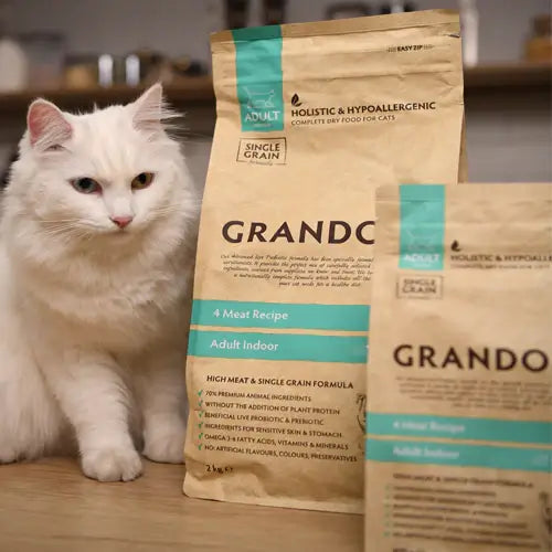 Hrana uscata pentru pisici Grandorf, cu 4 Tipuri de Carne, pentru Pisici Adulti Indoor