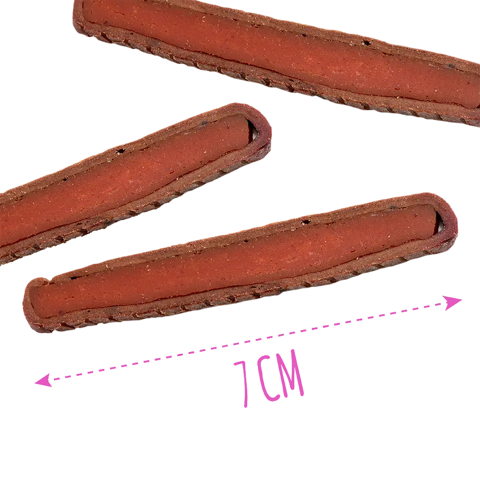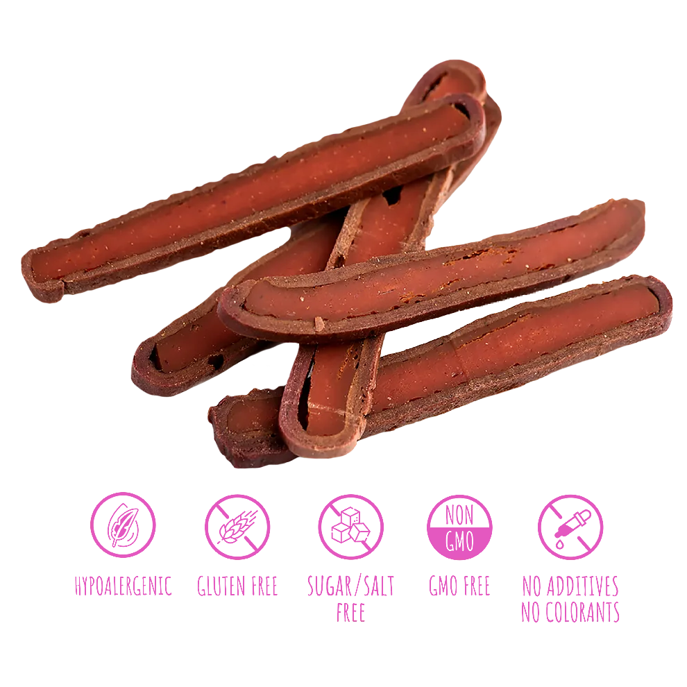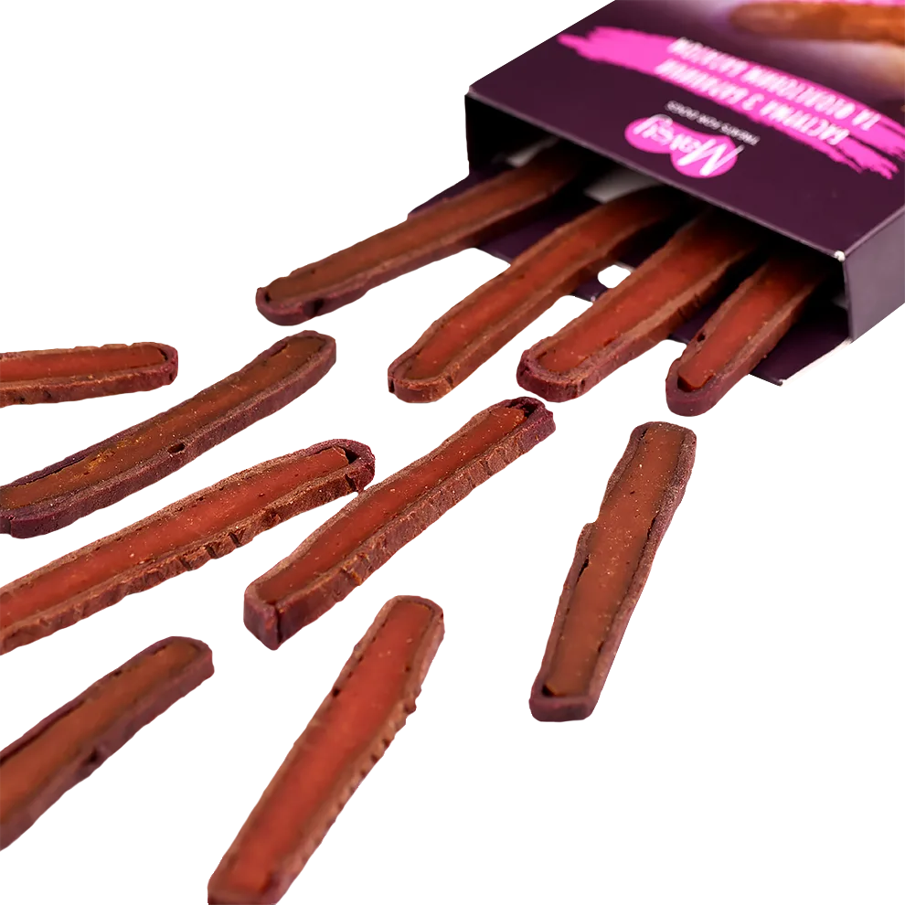 Това ястие лесно би зарадвало дегустационното меню на всеки готвач: деликатната агнешка бастурма, комбинирана с лилави сладки картофи, създава изтънчен вкус, балансирайки елегантност и хранителна стойност. Изисканата комбинация от месо и зеленчуци създава незабравимо вкусово изживяване. Нещо повече, това е идеална награда за вашето куче! Сместа от висококачествено месо и богати на хранителни вещества зеленчуци осигурява балансирана, лесно смилаема закуска, която повишава енергията на вашия домашен любимец. Подходяща като ежедневно допълнение към вашата диета или като вкусна награда за възрастни кучета от всички породи и кученца над 3 месеца, нейният естествен състав, лесна смилаемост и примамлив вкус бързо ще превърнат тази награда в любима част от деня на вашето куче. ⏵ Агнешко – богато на протеини и полезни мазнини, осигуряващи енергия и издръжливост. ⏵Патешко – нежно, богато на витамини от група В за лъскава козина и сърдечна функция. ⏵ Лилав сладък картоф – антиоксиданти и фибри, които подпомагат имунитета и доброто храносмилане.