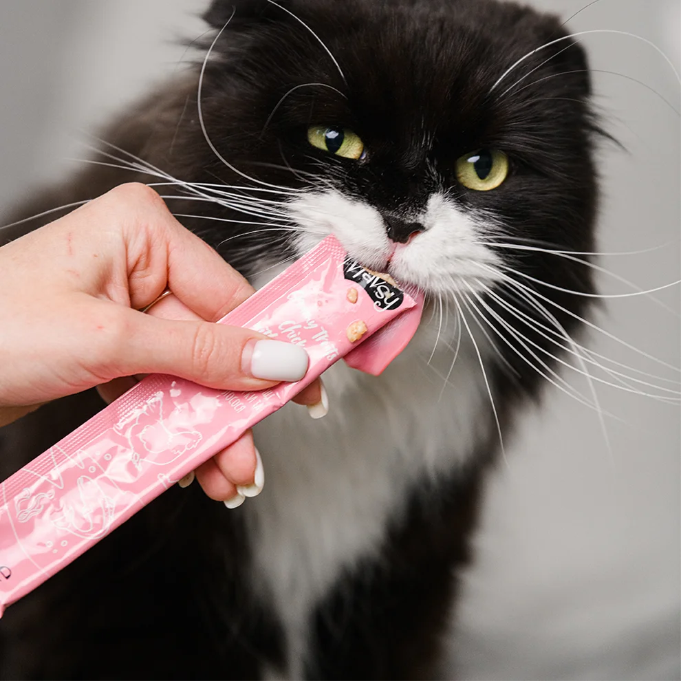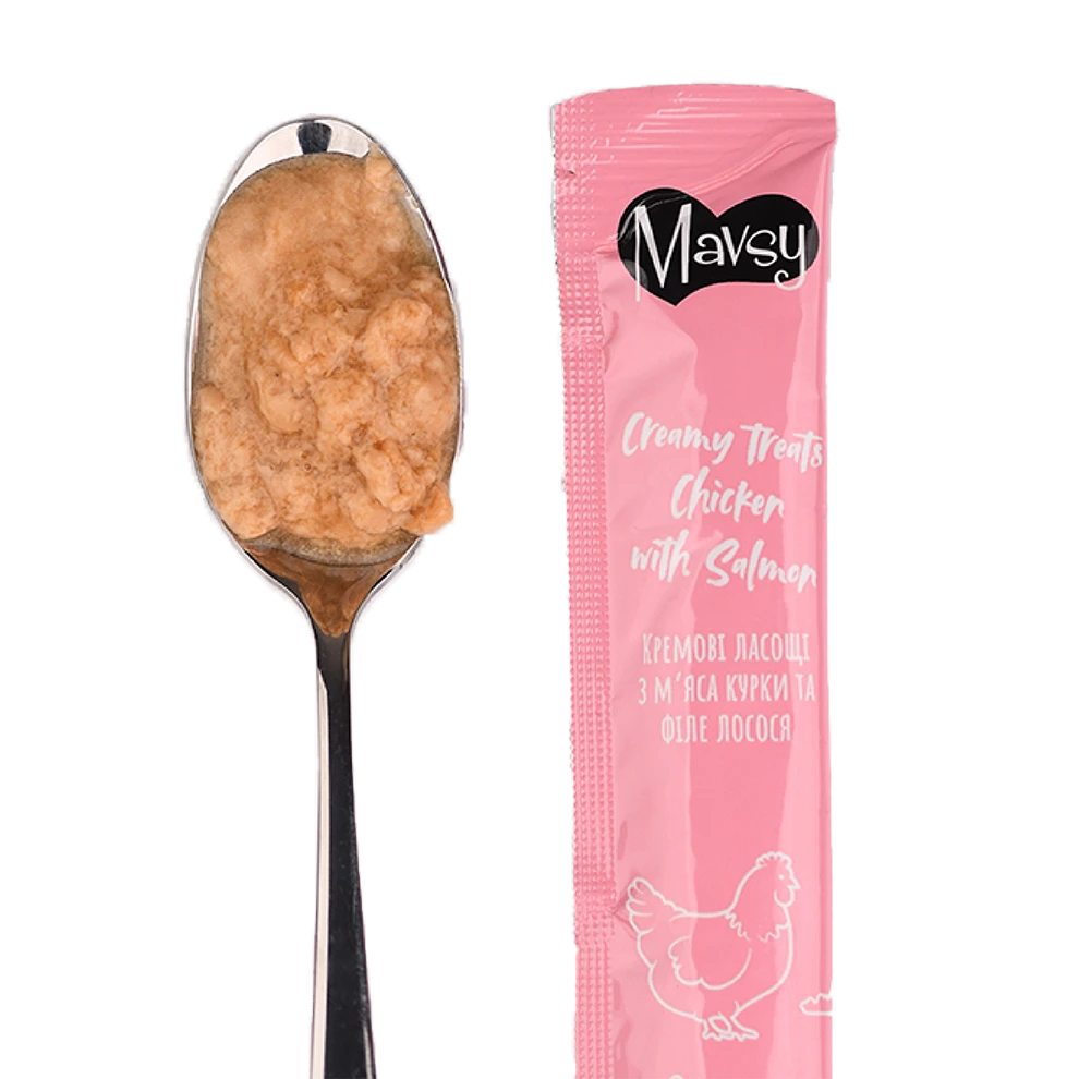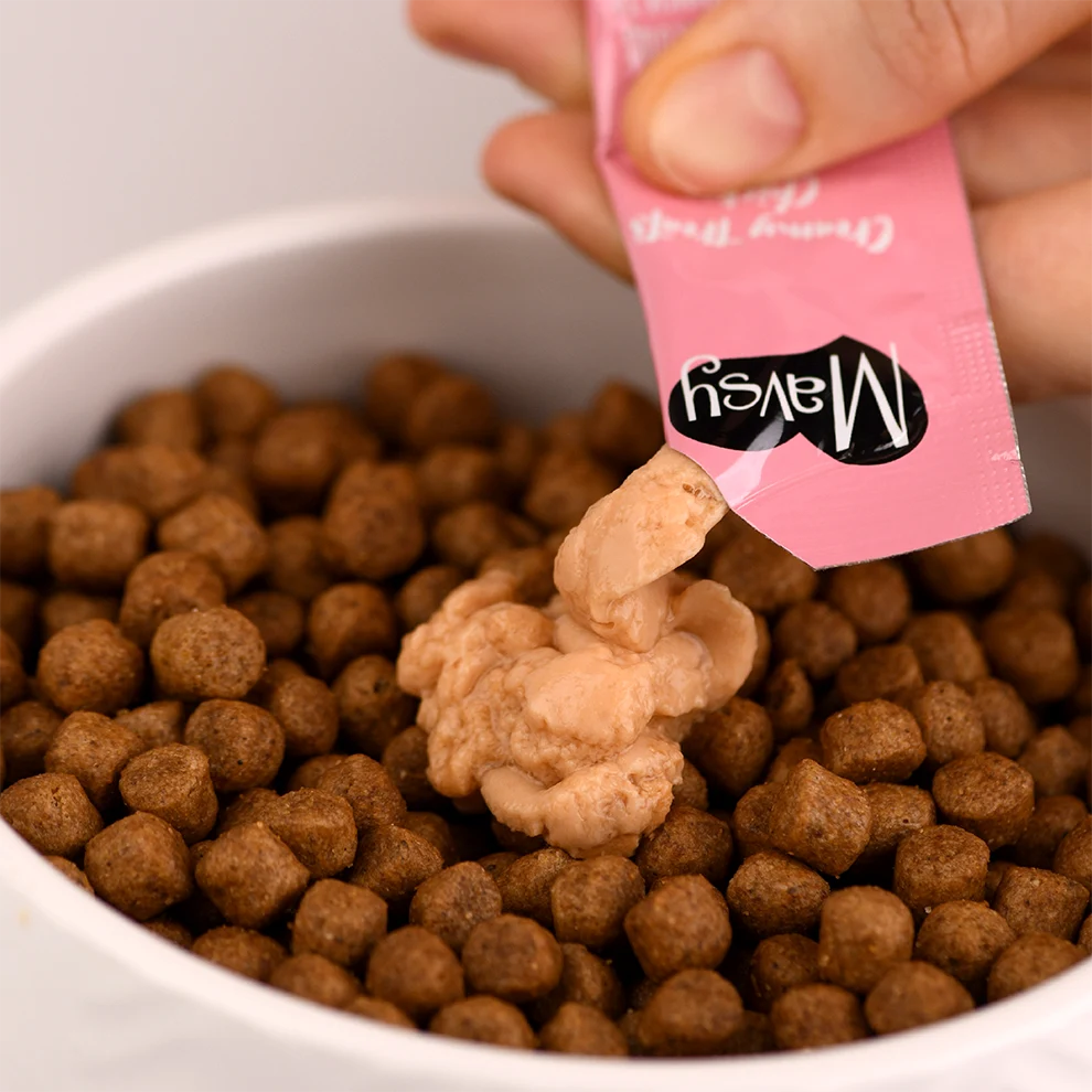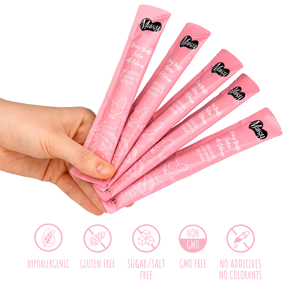 Състав: пилешко месо 30%, сьомга 10%, хидролизат от риба тон 3%, масло от семена 1%, картофено нишесте 0.8%, гума гуар 0.5%, карагенан 0.3%. Хранителни добавки: метионин, витамин А (3a672a - 160-240 IU/кг), витамин B1 (3a821 - 0.1 мг/кг), витамин B2 (3a825i - 0.08 мг/кг), витамин B6 (3a831 - 0.1 мг/кг), витамин D3 (3a671 - 14-26 IU/кг), витамин E (3a 700-500 мг/кг), калциев пантотенат, фолиева киселина, мед, манган, цинк, йод, селен - 0.2%.
