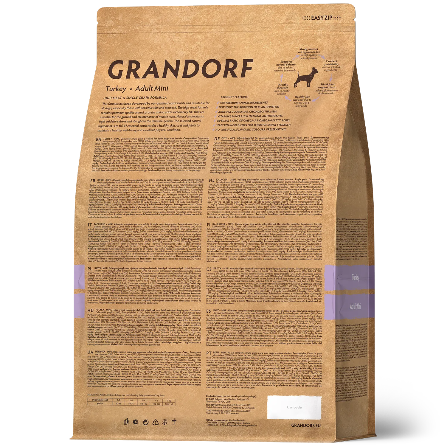Carnea proaspătă, hipoalergenică și nutritivă de curcan are un efect benefic asupra sistemului digestiv al câinelui. Datorită formulei monoproteice, ingredientelor hipoalergenice, unui singur tip de cereale și lipsei de gluten, hrana are o digestibilitate excelentă, o valoare nutritivă ridicată și contribuie la menținerea sănătății și vitalității animalului de companie pentru mulți ani.