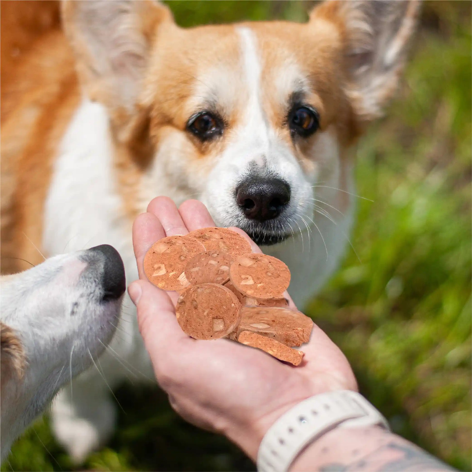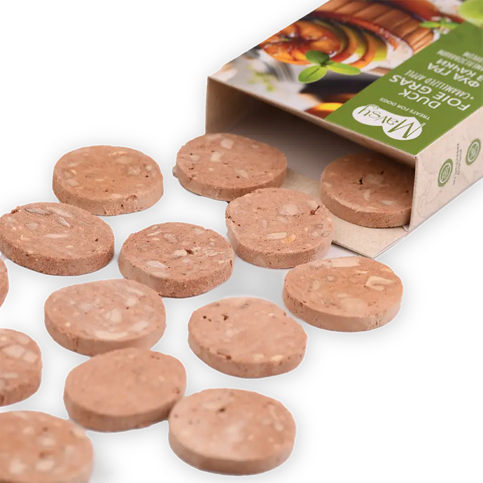 Asemenea unei capodopere culinare direct dintr-un restaurant francez rafinat, foie gras-ul de rață cu mere caramelizate încântă prin textura sa catifelată, profunzimea aromei și aroma irezistibilă. Nota subtil dulce, dar acrișoară, a mărului caramelizat auriu evidențiază elegant bogăția delicată a ficatului de rață, oferindu-i câinelui tău o experiență gastronomică delicioasă. Recompensele liofilizate Mavsy sunt mai mult decât simple gustări - sunt delicii gourmet pentru câinii care apreciază combinațiile sofisticate de arome . Hrănitoare, aromate și crocante, aceste recompense vor încânta chiar și cel mai exigent cunoscător canin. Foie gras de rață – bogat în grăsimi și proteine benefice pentru energie susținută, piele sănătoasă și o blană strălucitoare. Mărul – oferă antioxidanți, susține o digestie sănătoasă și întărește imunitatea. Proteine pe bază de plante – stimulează forța musculară și vitalitatea generală