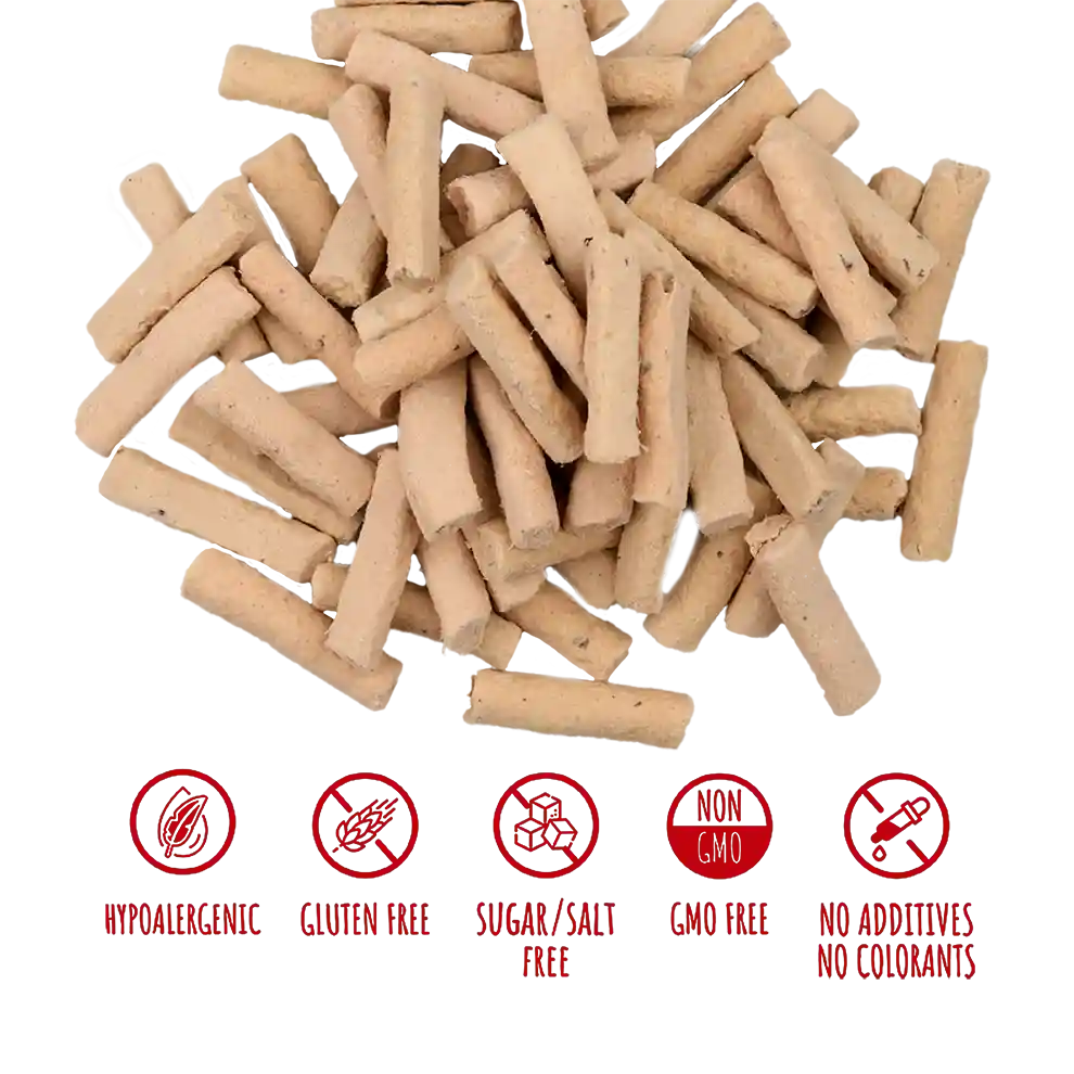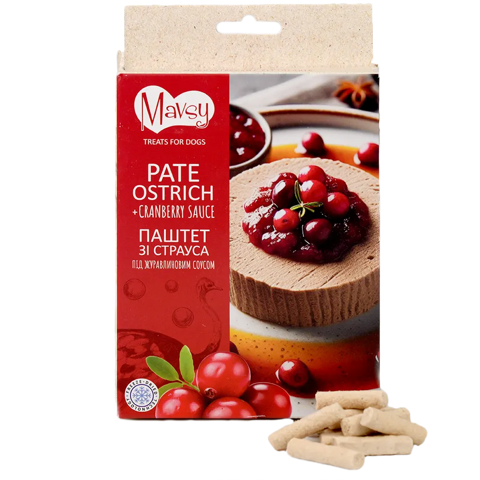 Servit într-un restaurant fine dining, acest pateu i-ar impresiona chiar și pe cei mai exigenți gurmanzi: carne delicată de struț cu o textură fragedă, completată perfect de nota proaspătă și ușor acrișoară a sosului de merișoare. Un amestec sofisticat de ușurință și profunzime a aromei , care lasă o impresie gastronomică rafinată. Pateul de struț liofilizat Mavsy cu sos de merișoare este o delicatesă deosebită pentru câini - moale, nutritiv, aromat și perfect ca adaos zilnic la dieta sau recompensă delicioasă. Ideal pentru câini adulți de toate rasele și pui de la trei luni. Struț și miel: proteine hipoalergenice care oferă energie și susțin forța musculară. Lapte integral de oaie și brânză: surse de calciu și grăsimi sănătoase pentru oase puternice și o blană strălucitoare. Rață: adaugă calități nutritive și o textură mătăsoasă. Merișor: un antioxidant natural care susține imunitatea și sănătatea urinară.