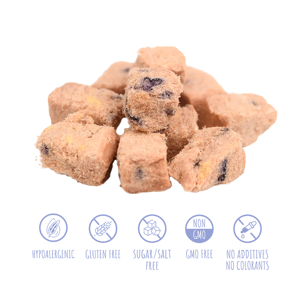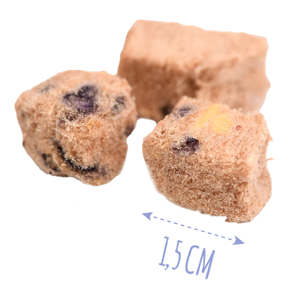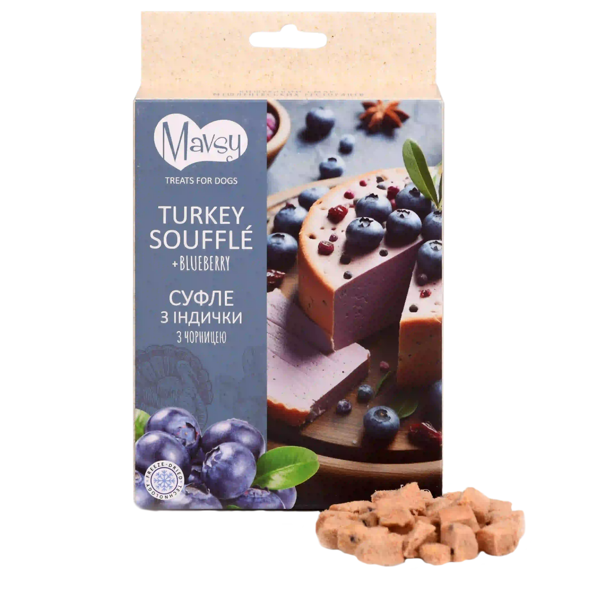 O delicatesă rafinată pe care ați putea-o descoperi în meniul unui restaurant contemporan de lux: un sufleu delicat, aerisit, de curcan, care se topește fără efort pe limbă, perfect echilibrat de acrișorul strălucitor și prospețimea subtilă de pădure a afinelor coapte. Această delicatesă încântă prin textura sa impresionantă și amestecul armonios de arome . Acum, această capodoperă gastronomică este creată special pentru iubitul tău animal de companie! O gustare delicioasă și ușoară, este ideală pentru savurarea zilnică sau ca o răsfăț motivațional. Fiecare îmbucătură aduce energie, promovează sănătatea și captivează de la prima gustare. Curcan și rață – proteine ușor digerabile pentru o mușchi puternică și o vitalitate de lungă durată. Afine – îmbunătățesc digestia și susțin o floră intestinală sănătoasă. Gălbenuș de ou și lapte praf – surse de grăsimi benefice și calciu, care promovează oase puternice și o blană strălucitoare.