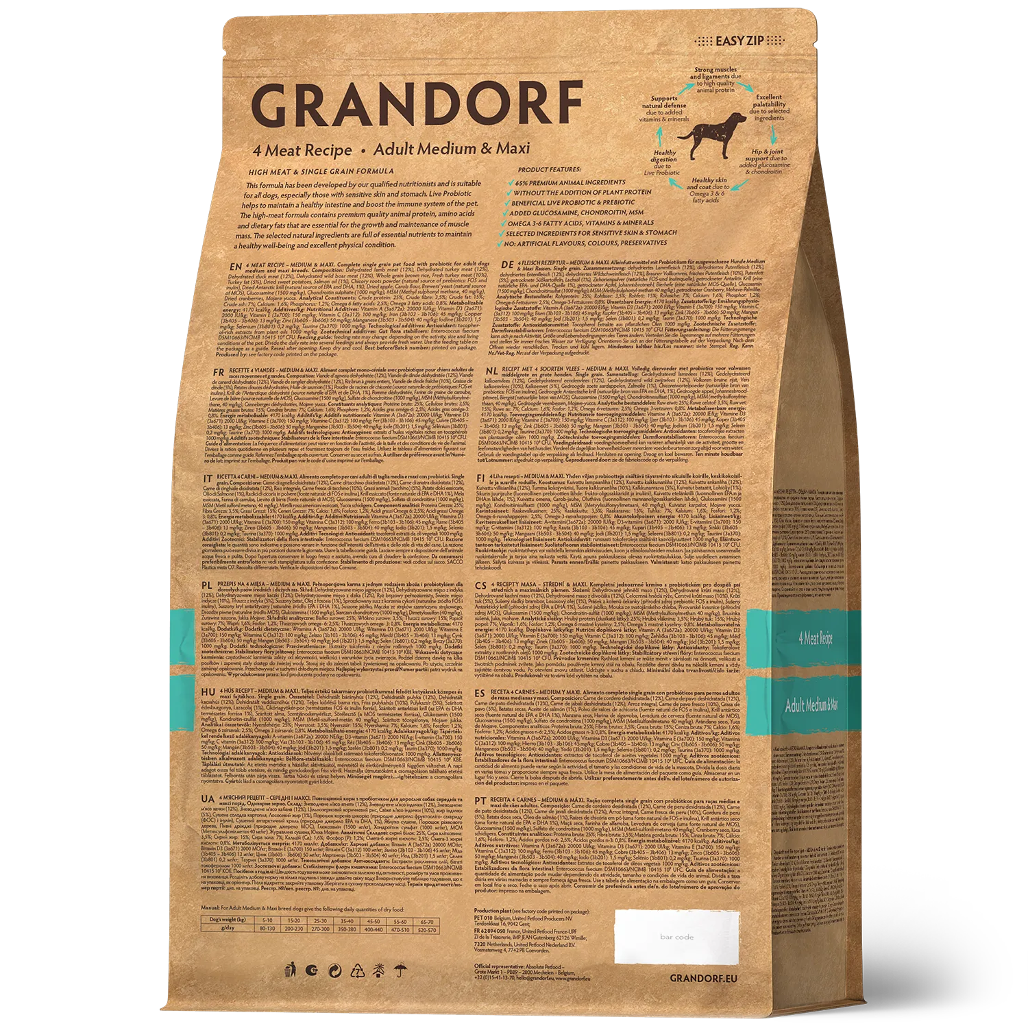 Hrana uscata pentru câini Grandorf, 4 Tipuri de Carne, pentru rase medii si mari