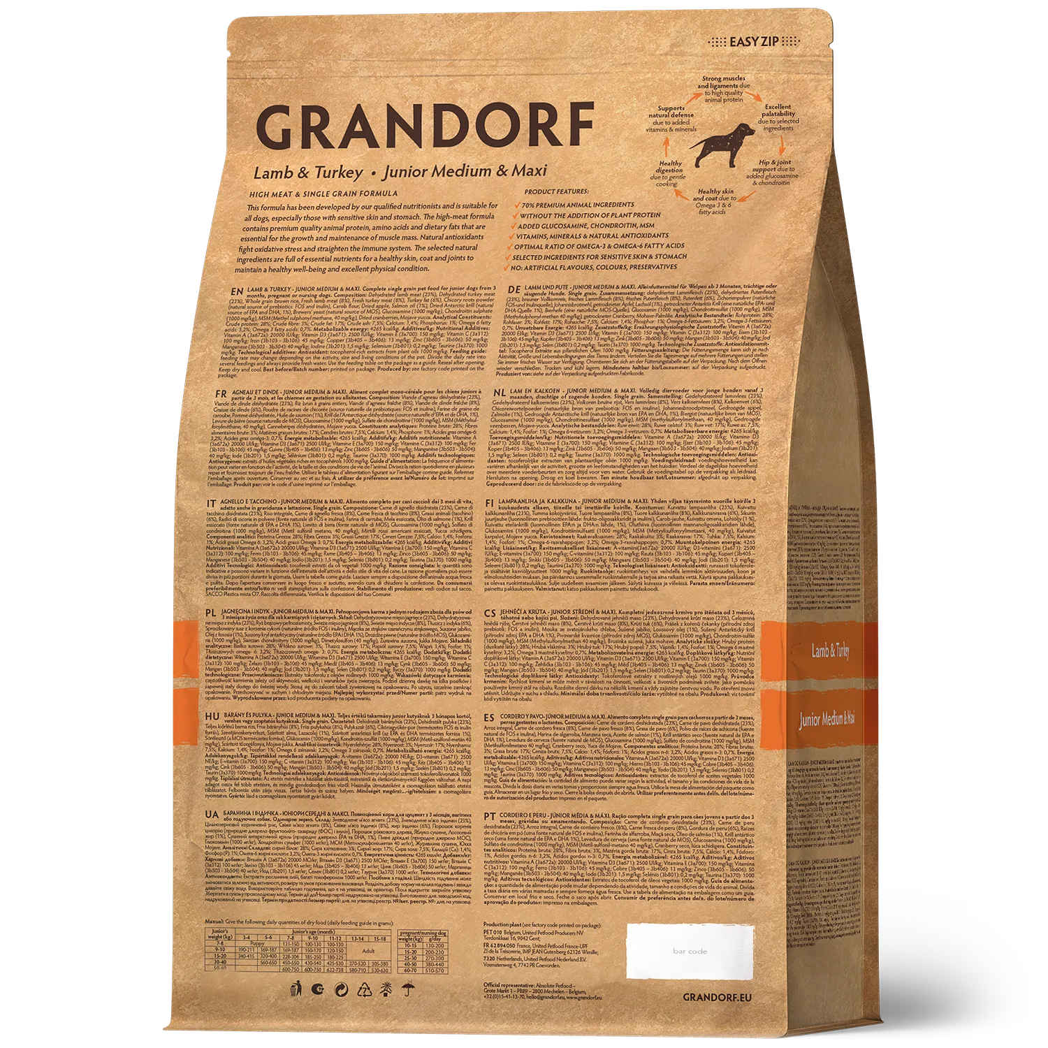 Hrana uscata pentru câini Grandorf, Miel cu Curcan, pentru juniori de rase medii si mari