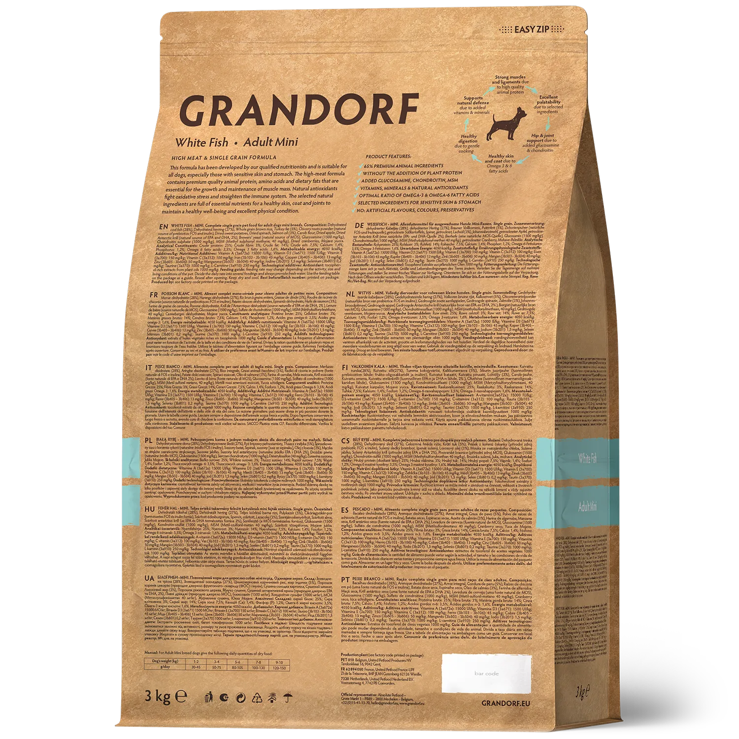 Compoziția cu conținut scăzut de cereale și ingredientele naturale, hipoalergenice, combinate cu carnea dietetică de pește alb, ajută la prevenirea reacțiilor alergice și a intoleranțelor alimentare, asigurând sănătatea sistemului imunitar și digestiv.
