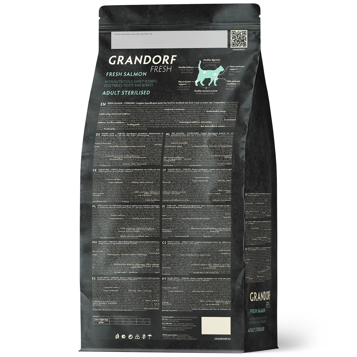 Hrana uscata pentru pisici Grandorf, cu File de Somon Proaspat si Cartofi Dulci, pentru Pisici Sterilizate sau Seniori