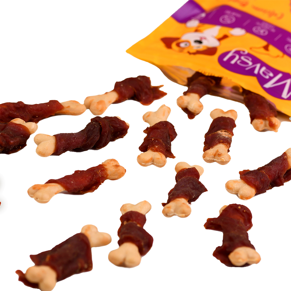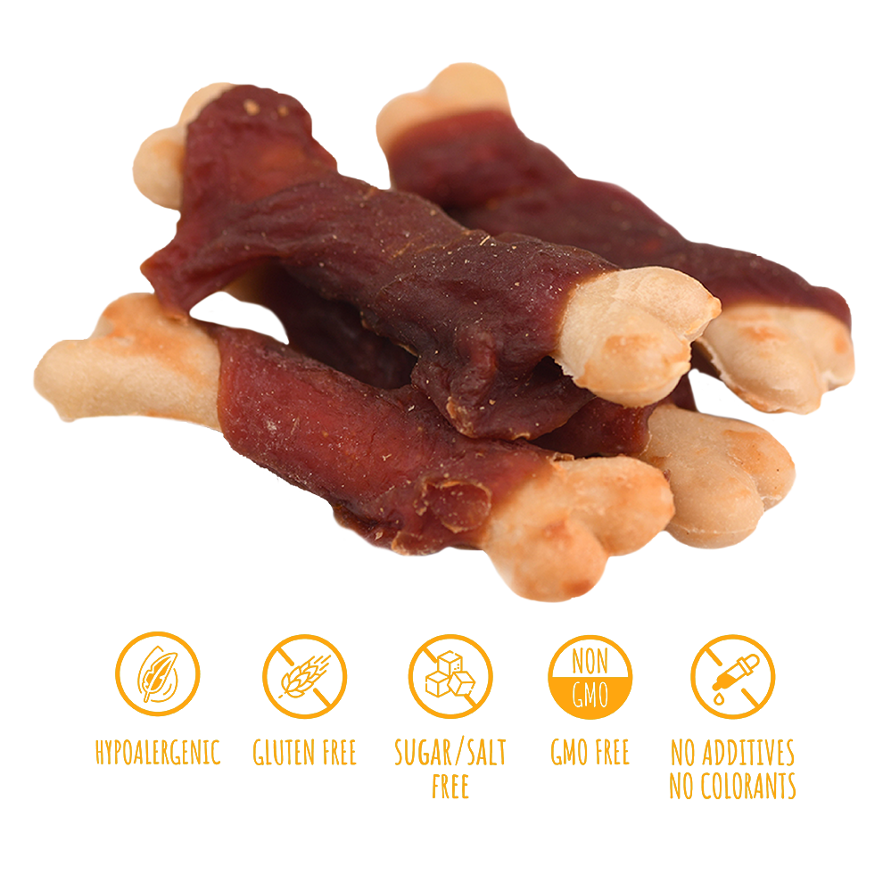 Această recompensă ar deveni rapid un bestseller într-o cafenea canină: carne suculentă de rață combinată cu un os crocant de calciu - delicioasă și benefică. Îi oferă câinelui tău plăcerea de a mesteca, promovând în același timp dinți puternici și oase sănătoase. Mavsy Calcium Bone cu rață este mai mult decât o simplă delicatesă; este o gustare funcțională care combină plăcerea gourmet cu îngrijirea orală. Ideală pentru mestecat prelungit, curăță în mod natural dinții, masează gingiile și îți menține prietenul blănos ocupat acasă sau în aer liber. Rață – carne gustoasă și hrănitoare, bogată în proteine, pentru energie și forță. Calciu Osos – susține sănătatea dinților, a gingiilor și a oaselor puternice.
