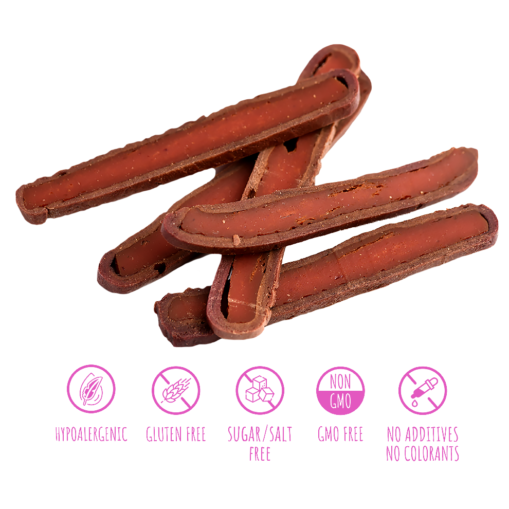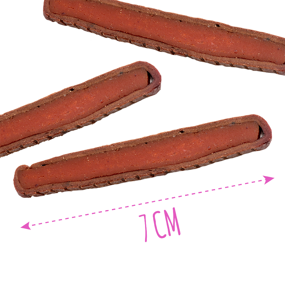 Acest fel de mâncare ar încânta cu ușurință meniul degustare al oricărui bucătar: delicata basturma de miel , combinată cu cartofi dulci mov, creează o aromă sofisticată , echilibrând eleganța și valoarea nutritivă. Combinația rafinată de carne și legume creează o experiență gustativă de neuitat. Mai mult, este o recompensă ideală pentru câinele tău! Amestecul de carne de înaltă calitate și legume bogate în nutrienți oferă o gustare echilibrată, ușor digerabilă, care stimulează energia animalului tău de companie. Potrivită ca adaos zilnic la dieta ta sau ca recompensă gustoasă pentru câinii adulți de toate rasele și puii de la 3 luni, compoziția sa naturală, digestibilitatea ușoară și aroma îmbietoare vor transforma rapid această recompensă într-o parte preferată a zilei câinelui tău. ⏵ Miel – bogat în proteine și grăsimi benefice, oferind energie și rezistență. ⏵ Rață – fragedă, bogată în vitamine B pentru blană strălucitoare și funcționarea inimii. ⏵ Cartof dulce mov – antioxidanți și fibre care susțin imunitatea și o digestie blândă.