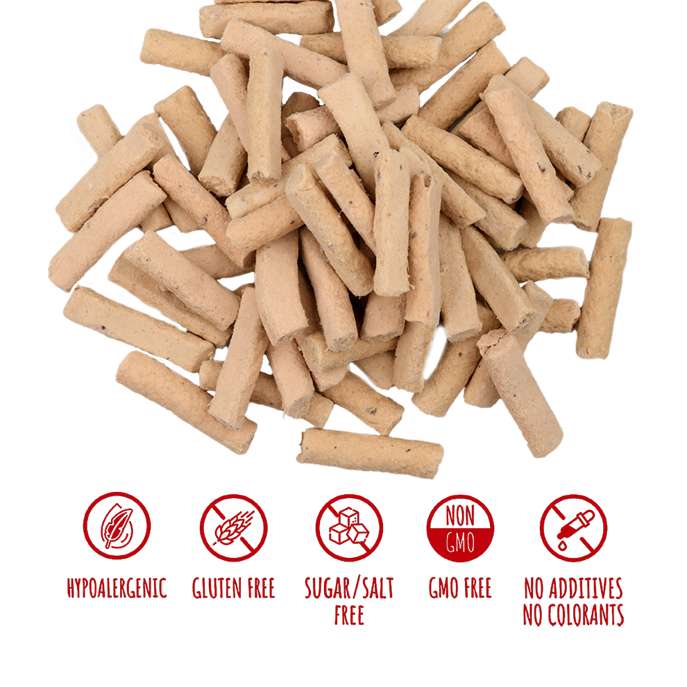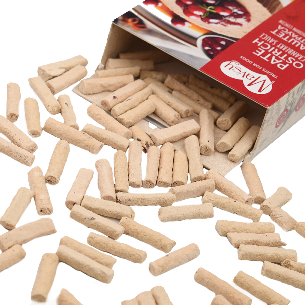 Servit într-un restaurant fine dining, acest pateu i-ar impresiona chiar și pe cei mai exigenți gurmanzi: carne delicată de struț cu o textură fragedă, completată perfect de nota proaspătă și ușor acrișoară a sosului de merișoare. Un amestec sofisticat de ușurință și profunzime a aromei , care lasă o impresie gastronomică rafinată. Pateul de struț liofilizat Mavsy cu sos de merișoare este o delicatesă deosebită pentru câini - moale, nutritiv, aromat și perfect ca adaos zilnic la dieta sau recompensă delicioasă. Ideal pentru câini adulți de toate rasele și pui de la trei luni. Struț și miel: proteine hipoalergenice care oferă energie și susțin forța musculară. Lapte integral de oaie și brânză: surse de calciu și grăsimi sănătoase pentru oase puternice și o blană strălucitoare. Rață: adaugă calități nutritive și o textură mătăsoasă. Merișor: un antioxidant natural care susține imunitatea și sănătatea urinară.