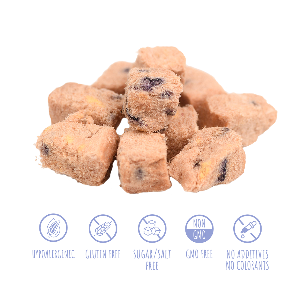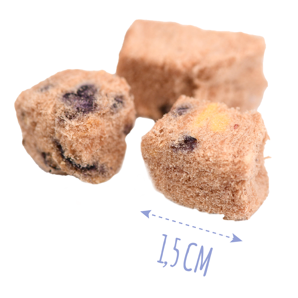 O delicatesă rafinată pe care ați putea-o descoperi în meniul unui restaurant contemporan de lux: un sufleu delicat, aerisit, de curcan, care se topește fără efort pe limbă, perfect echilibrat de acrișorul strălucitor și prospețimea subtilă de pădure a afinelor coapte. Această delicatesă încântă prin textura sa impresionantă și amestecul armonios de arome . Acum, această capodoperă gastronomică este creată special pentru iubitul tău animal de companie! O gustare delicioasă și ușoară, este ideală pentru savurarea zilnică sau ca o răsfăț motivațional. Fiecare îmbucătură aduce energie, promovează sănătatea și captivează de la prima gustare. Curcan și rață – proteine ușor digerabile pentru o mușchi puternică și o vitalitate de lungă durată. Afine – îmbunătățesc digestia și susțin o floră intestinală sănătoasă. Gălbenuș de ou și lapte praf – surse de grăsimi benefice și calciu, care promovează oase puternice și o blană strălucitoare.