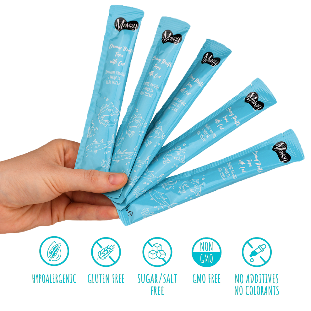 Composition: ton 30%, cod 10%, hidrolizat de ton 3%, ulei de semințe 1%, amidon din cartofi 0,8%, gumă de guar 0,5%, caragenan 0,3%. Aditivi nutriționali: metionină, vitamina A (3a672a - 160-240 UI/kg), vitamina B1(3a821 - 0,1 mg/kg), vitamina B2 (3a825i - 0,08 mg/kg), vitamina B6 (3a831 - 0,1 mg/kg), vitamina D3 (3a671 - 14-26 UI/kg), vitamina E (3a 700-500 mg/kg), pantotenat de calciu, acid folic, cupru, mangan, zinc, iod, seleniu - 0,2%.